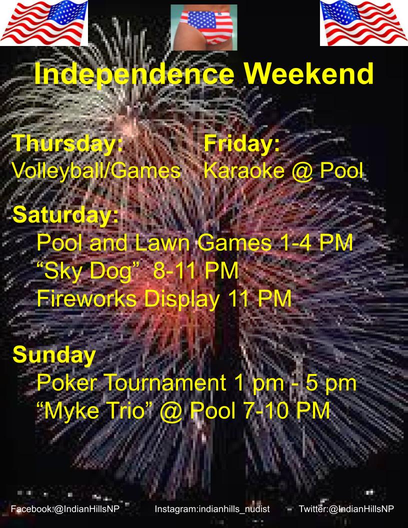 Independence Weekend Post author By admin Post date December 2, 2021 No Comments on Independence Weekend Calendar Add to Calendar Add to Timely Calendar Add to Google Add to Outlook Add to Apple Calendar Add to other calendar Export to XML When: July 1, 2022 – July 4, 2022 all-day 2022-07-01T00:00:00-05:00 2022-07-05T00:00:00-05:00 Party’s, BBQ, and Fireworks. These all work with nudity, right? ← June Birthday Celebrations → Mid Summer’s Night Dream Party Leave a Reply Cancel replyYour email address will not be published. Required fields are marked *Comment * Name * Email * Website Save my name, email, and website in this browser for the next time I comment.
