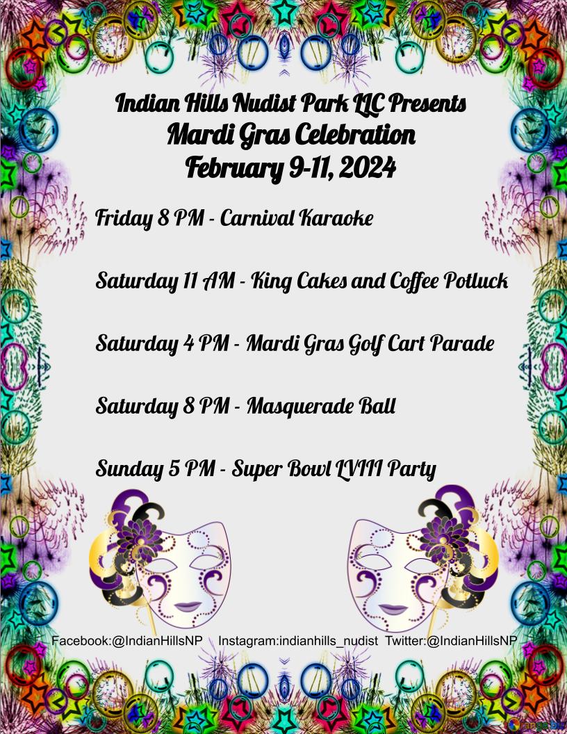 Mardi Gras Ball Post author By admin Post date October 4, 2023 No Comments on Mardi Gras Ball Calendar Add to Calendar Add to Timely Calendar Add to Google Add to Outlook Add to Apple Calendar Add to other calendar Export to XML When: February 10, 2024 @ 8:00 pm 2024-02-10T20:00:00-06:00 2024-02-10T20:15:00-06:00 King Cake Breakfast Potluck 10 am Golf Cart Parade at 6 pm Masquerade Ball at 8 pm ← Open Mic Comedy Night → Valentine Dance Leave a Reply Cancel replyYour email address will not be published. Required fields are marked *Comment * Name * Email * Website Save my name, email, and website in this browser for the next time I comment.