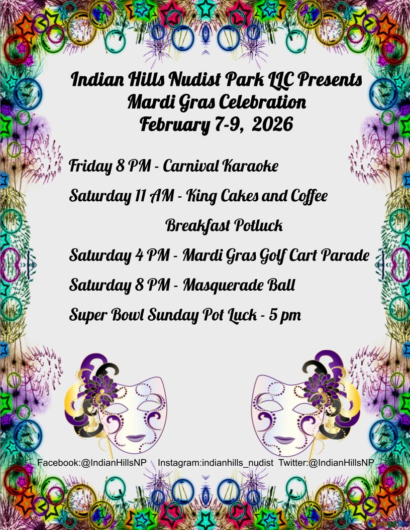 Mardi Gras Masquerade Post author By admin Post date December 3, 2025 No Comments on Mardi Gras Masquerade Calendar Add to Calendar Add to Timely Calendar Add to Google Add to Outlook Add to Apple Calendar Add to other calendar Export to XML When: February 7, 2026 @ 7:00 pm 2026-02-07T19:00:00-06:00 2026-02-07T19:15:00-06:00 Only clothes needed is a mask and some beads. Dance music night. ← January Birthdays and White Party. → Valentines Dance w/ Royal Court Announcement Leave a Reply Cancel replyYour email address will not be published. Required fields are marked *Comment * Name * Email * Website Save my name, email, and website in this browser for the next time I comment.